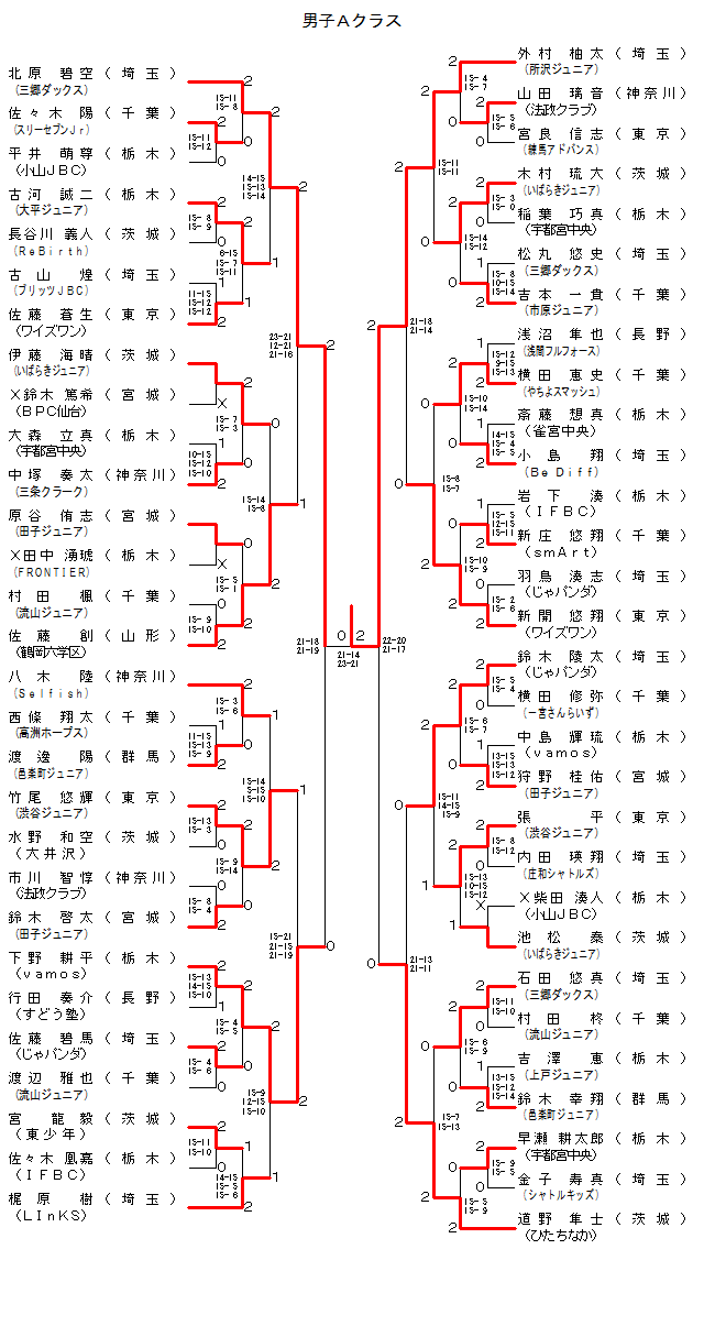 | BA-1 | スリーセブンJr[千葉] | 佐々木 陽 | 2 | 15-11 15-12 | 0 | 平井 萌尊 | 小山JBC[栃木] | |